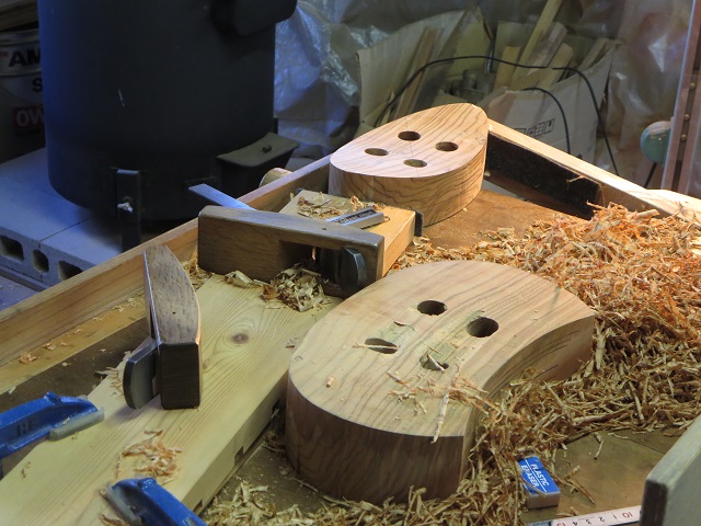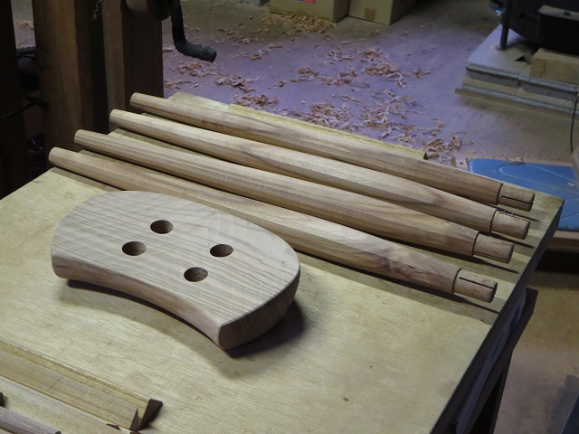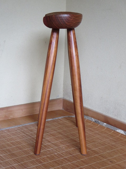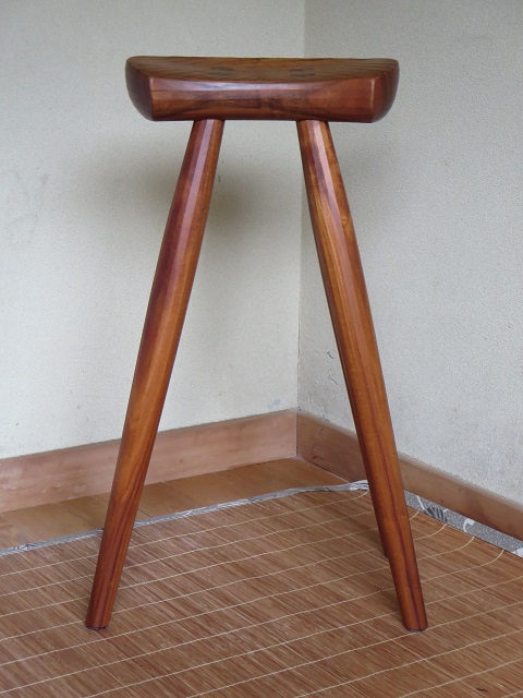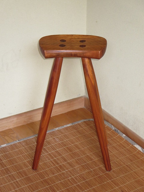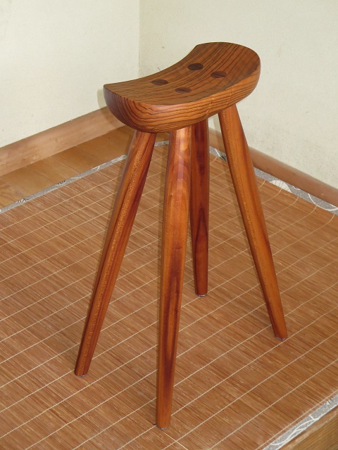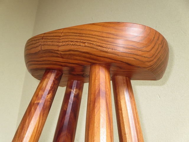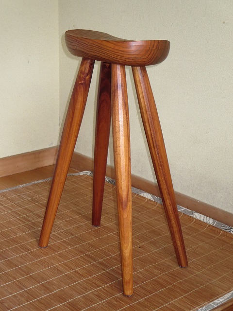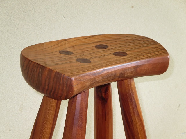 座板デザインに少々変化を付けたスツール。座板角部が腿裏に干渉しないようにするため、座面の彫り込み+削りに結構気を使いました。側面は手鉋による多面体に仕上げています。