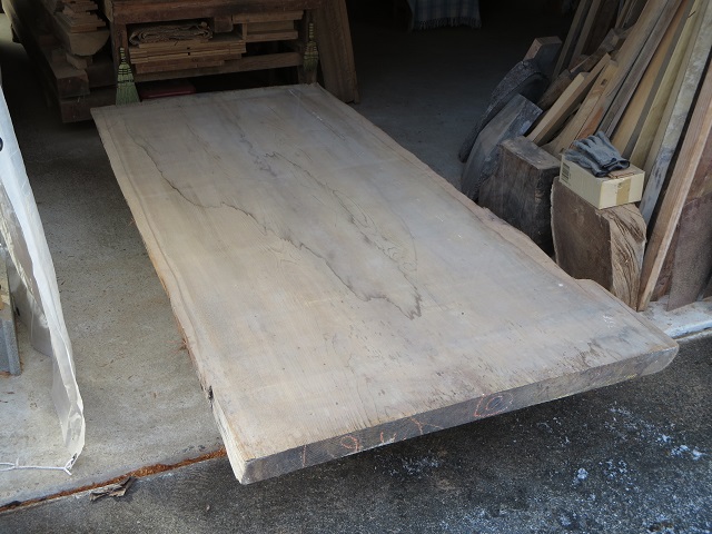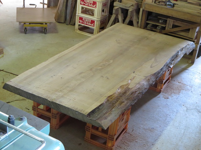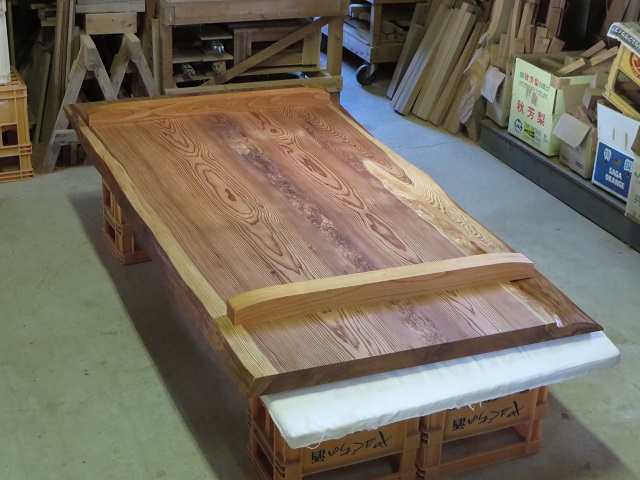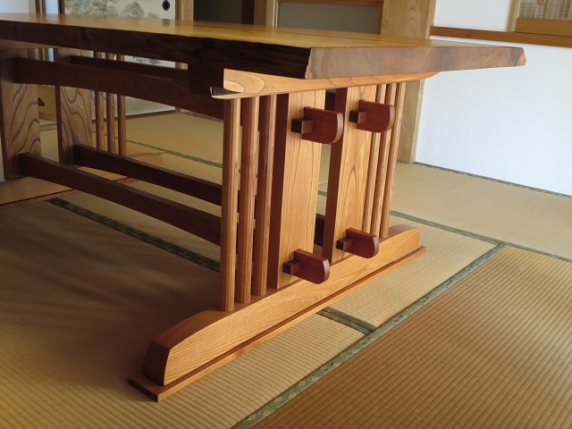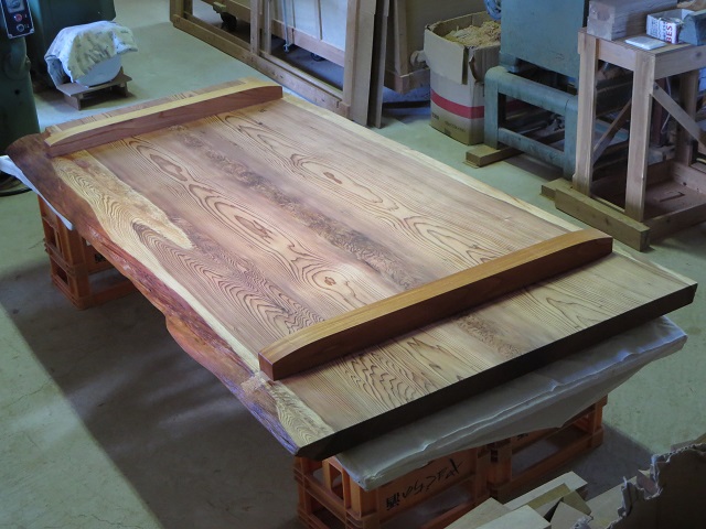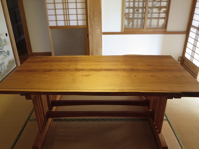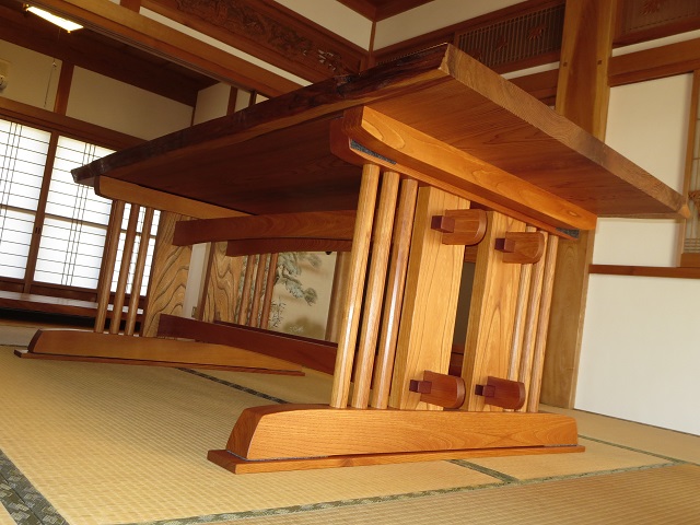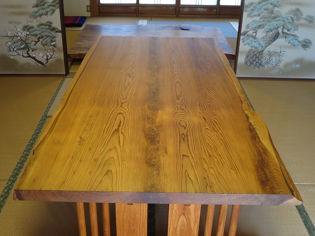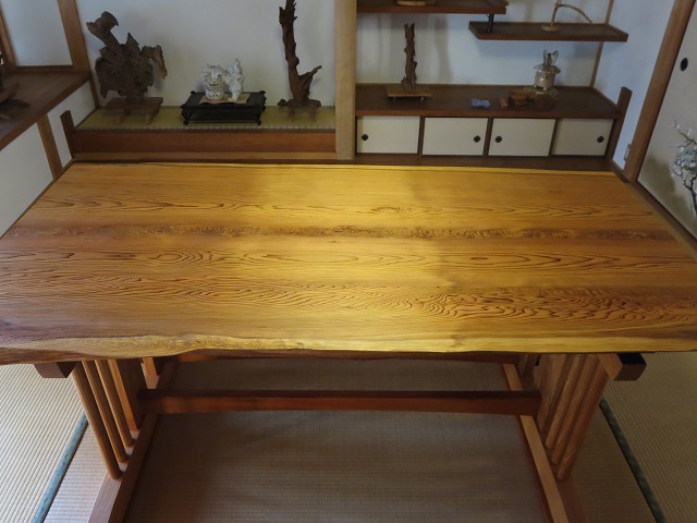 - 屋久杉一枚板を天板とした組立式テーブル。天板は土台に置いているだけで、土台は楔を取り外すことで分解することができます。天板はほぼ同様な筍杢が平行に並んでいるめずらしい(普通はあり得ない)一枚板。恐らく2本の木による連理木(合体木)と思われますが、個人的にここまできれいな連理木(合体木)の一枚板は初めてみました。接合部の木目はすごく複雑に絡み合っています。組立式テーブル01と同じお客様で土台は併用となります。