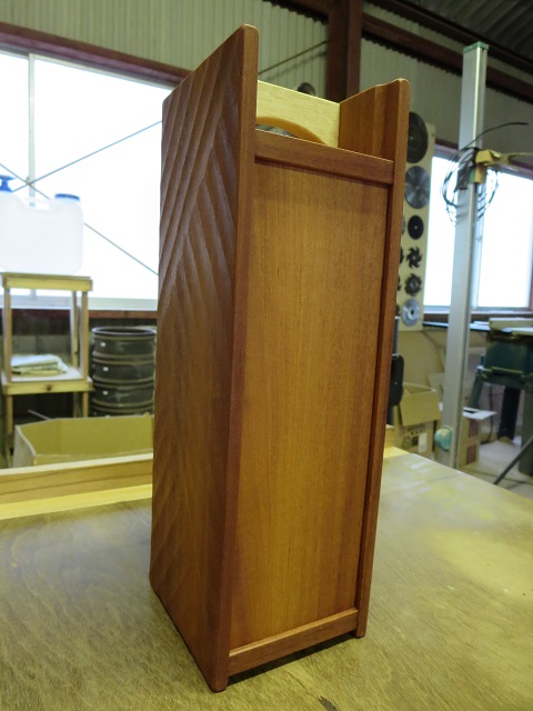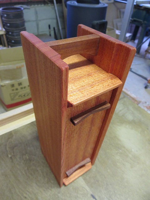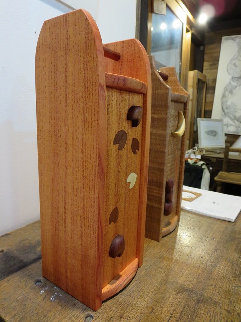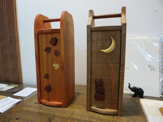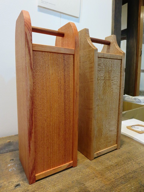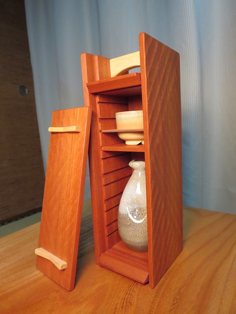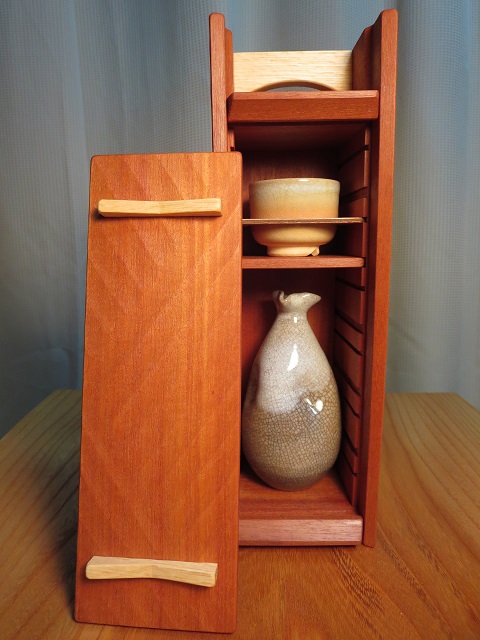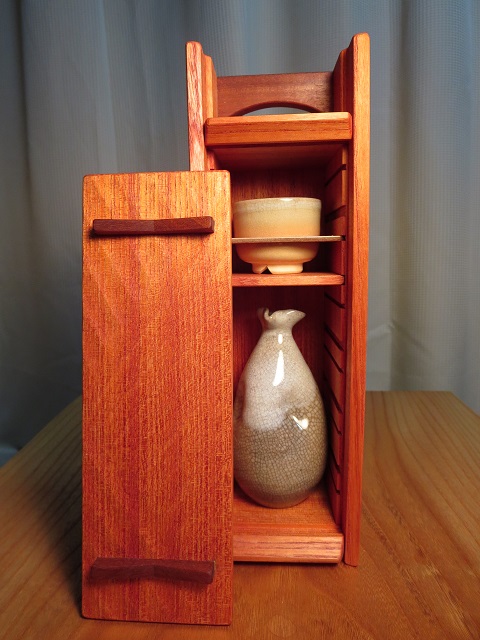 - 酒器(お猪口、徳利)等を収納もしくは持ち運ぶ(お花見へ、酒場へマイグラス(ロック+タンブラーグラス)持参、等)ための小箱です。本商品はオーダーメイドになりますので、材種、形状(棚:固定or可変、取っ手:丸棒or弓型、等)および装飾のご希望をお伺いした後、見積および納期を提示し、ご注文確定後に制作致します。萩市にあるアートショップtazz.様にて現品を直接購入することもできます。