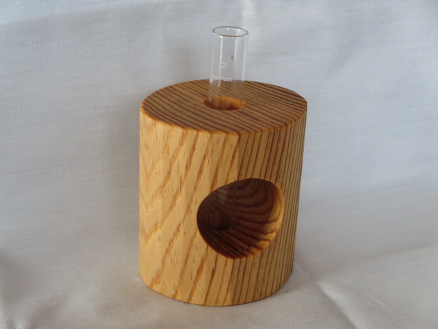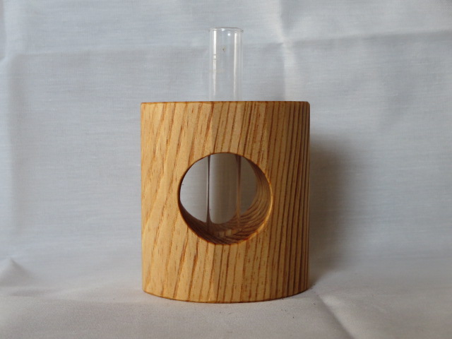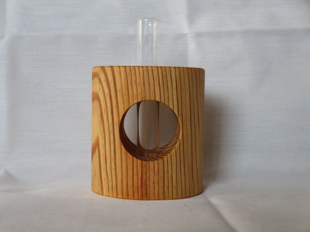 手鉋(豆平鉋)を用いて楕円形の十六角柱に成形しています。付属の壁掛け用の金具(三角吊カン+小ネジ)を取付けることにより壁に掛けて飾ることもできます。ガラス管付です。
