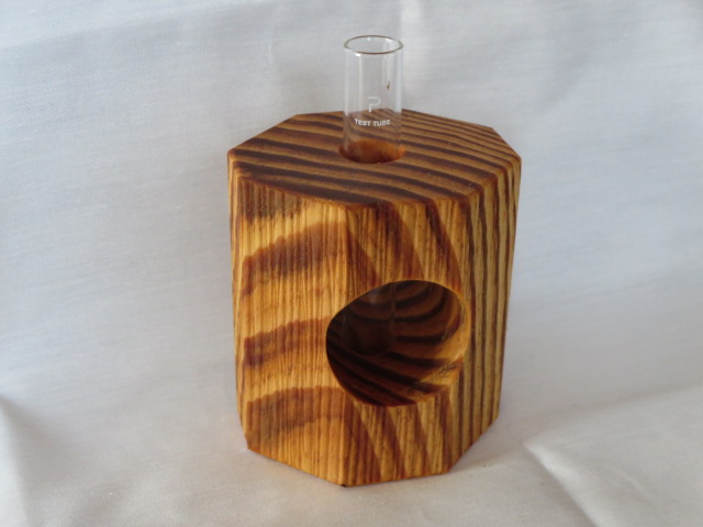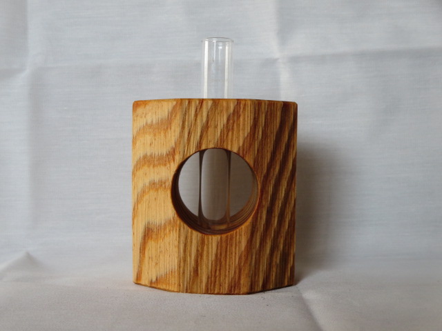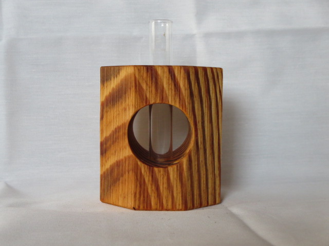 手鉋(豆平鉋)を用いて楕円形の八角柱に成形し、さらに別の手鉋(三角鉋)を用いて表面に装飾を施しています。付属の壁掛け用の金具(三角吊カン+小ネジ)を取付けることにより壁に掛けて飾ることもできます。ガラス管付です。