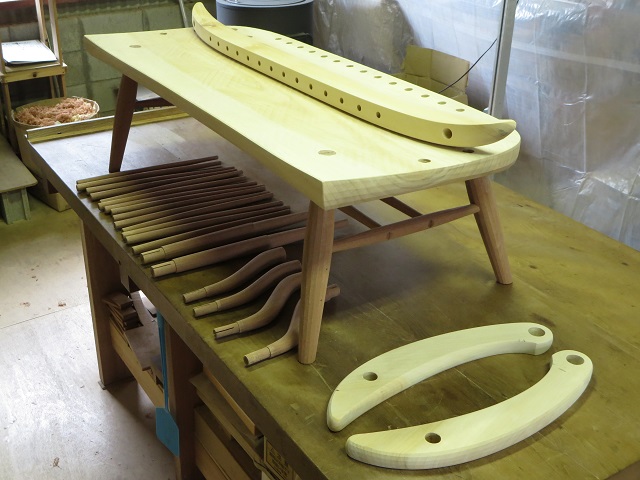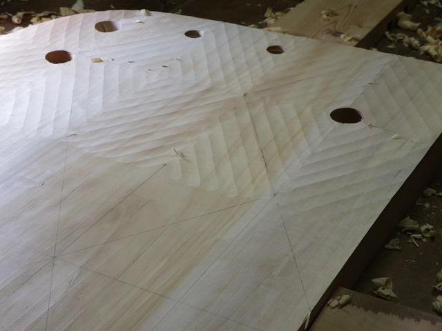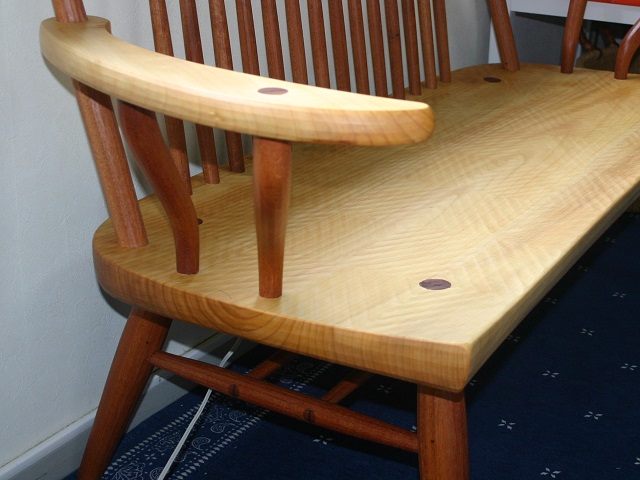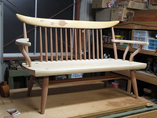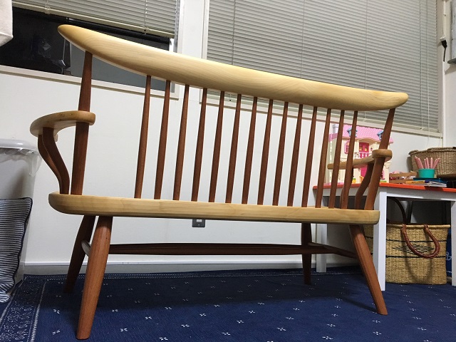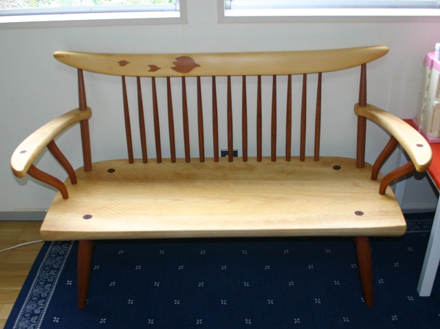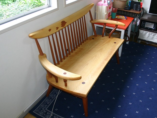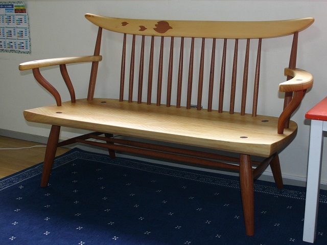 銀杏の一枚板を使用した2人掛け用の小振りなリビングベンチ。銀杏独特の色合い、柔らかさから三日月が頭に浮かんできて、随所に三日月をイメージしたデザインを取り入れました。座面の凹凸仕上げ時、銀杏の逆目彫りに予想以上に苦しめられました。良い経験となった一品です。