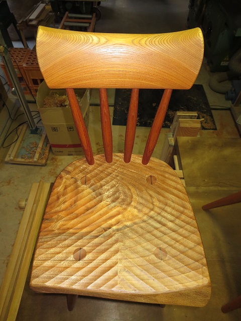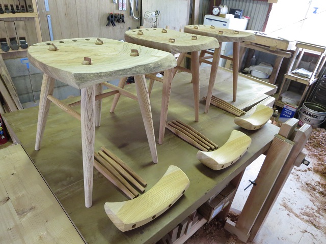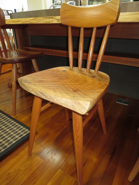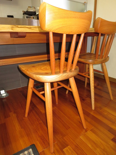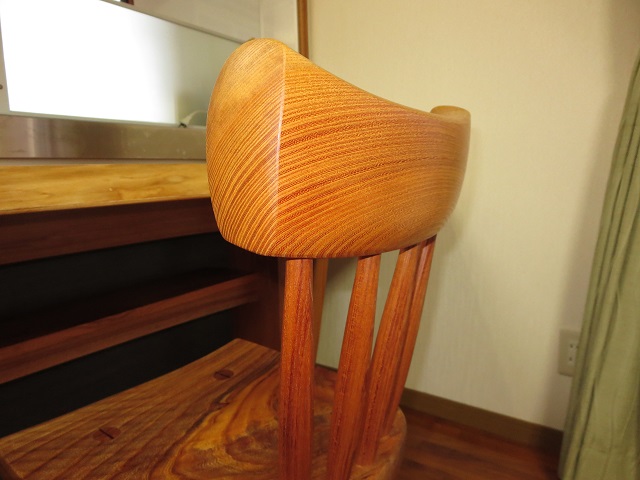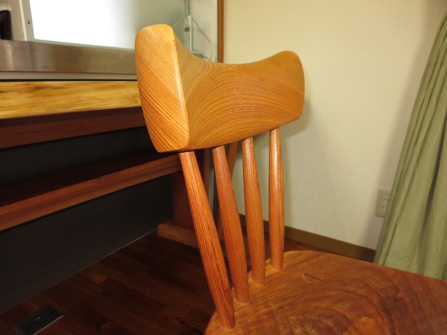 - セットとなるカウンターテーブル01と調和させるとともに、いつも以上に後姿の美しさを意識してデザインしました。また、耳付(皮部の形状をそのまま残したものですが、皮は剥いでいます)座板の荒々しさと小振りなカウンターチェアとしてのシャープさが共存することも意識しました。笠木はカウンターテーブル01のもととなった座卓の脚材を流用しています。
