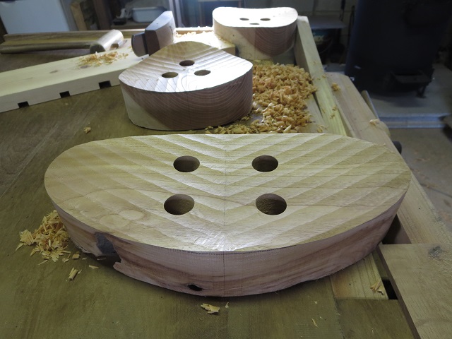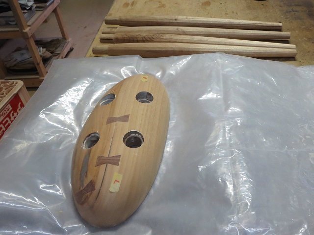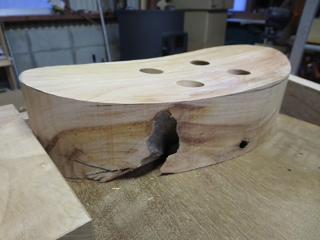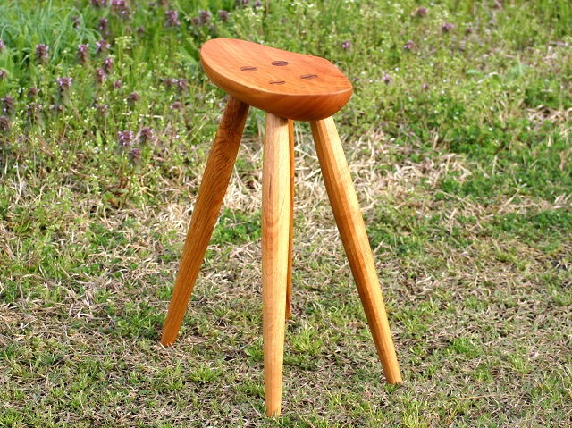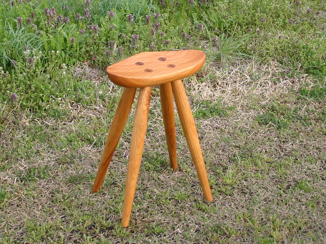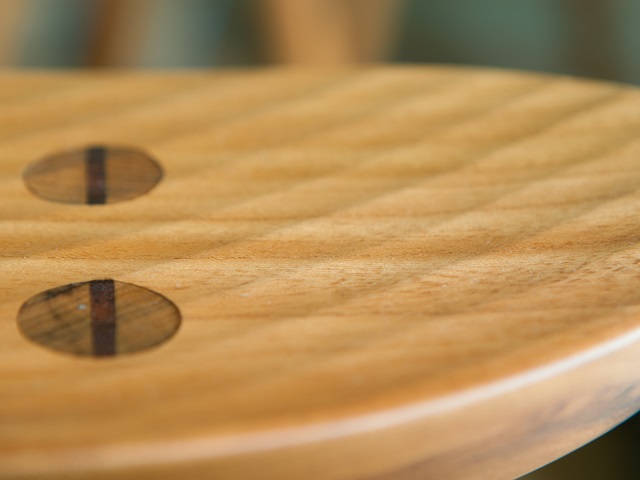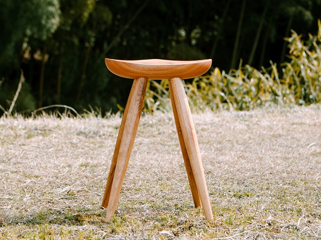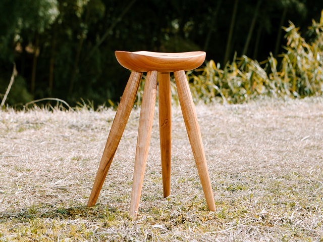 「座り続けていたいスツール」シリーズです。割れ、虫穴がひどく、放置されていた材を用いて制作しています。おおまかなデザインを決めた後は、木の声を聞きながら成形していきました。前後どちらの向きでも座り心地の違いを楽しめるように、座板を彫り込んでいます。割れ止めの補修も行っています。