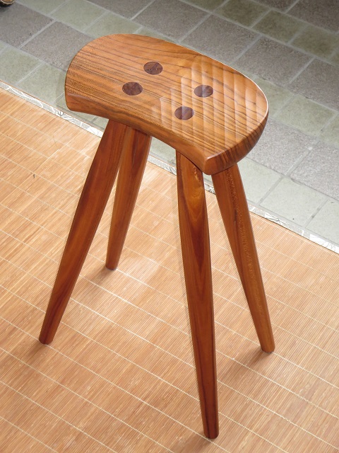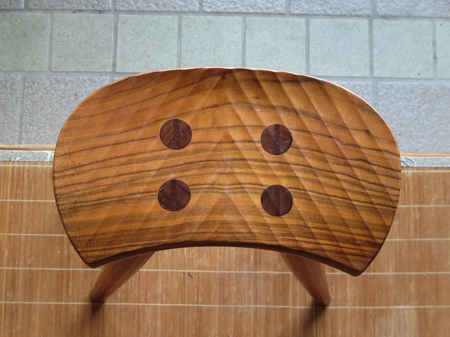 座板デザインに少々変化を付けたスツール。座板角部が腿裏に干渉しないようにするため、座面の彫り込み+削りに結構気を使いました。側面は手鉋による多面体に仕上げています。