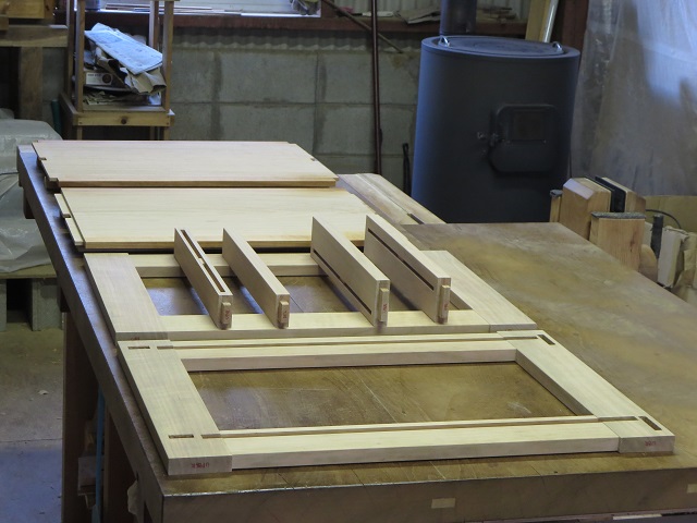 とのセットとして制作しました。本体枠組み+ファイル収納ケース+小物収納ケースの3体で構成されています。ファイル収納ケースは専用ファイルケースを格納できるレール付きです。小物収納ケースは手持ち穴付きでスリットにより収納スペースを変更することができます。どちらも蟻組接ぎで組んでいます。