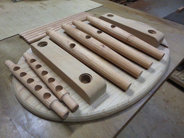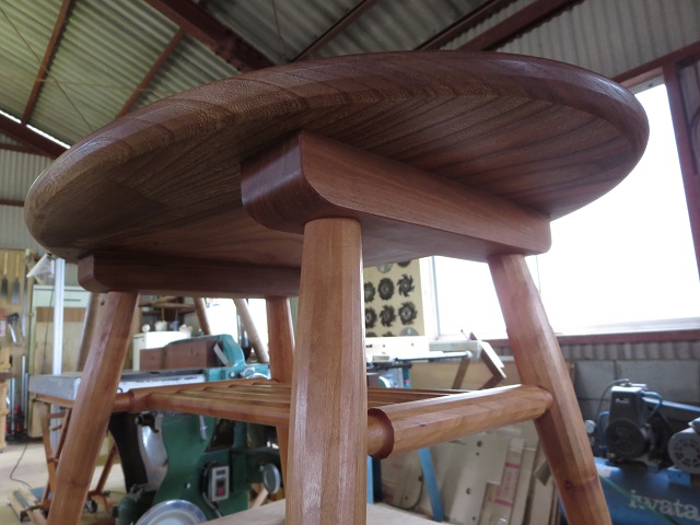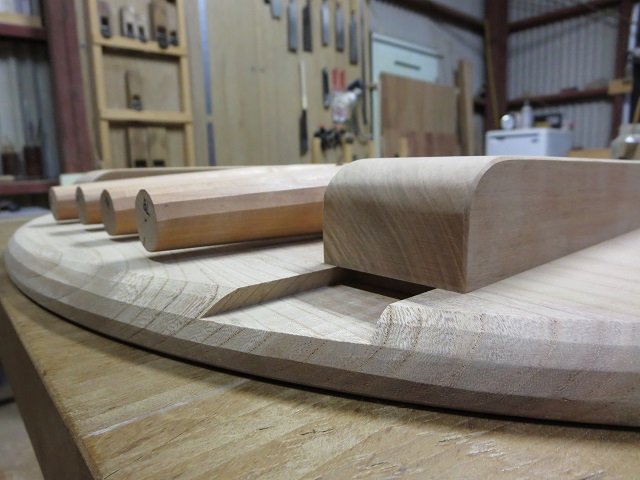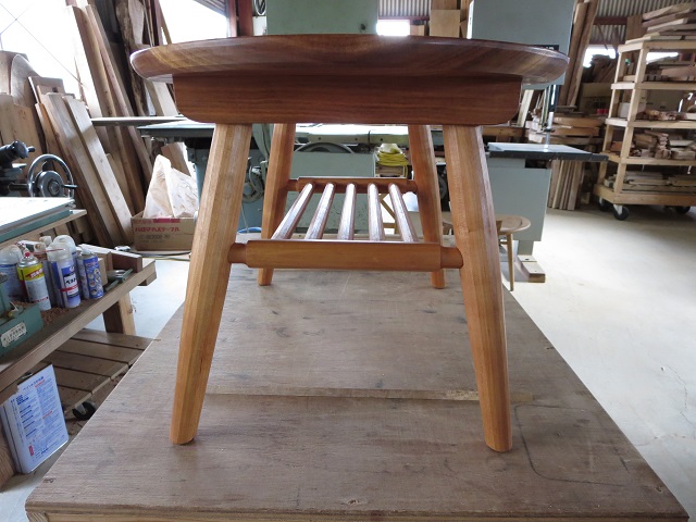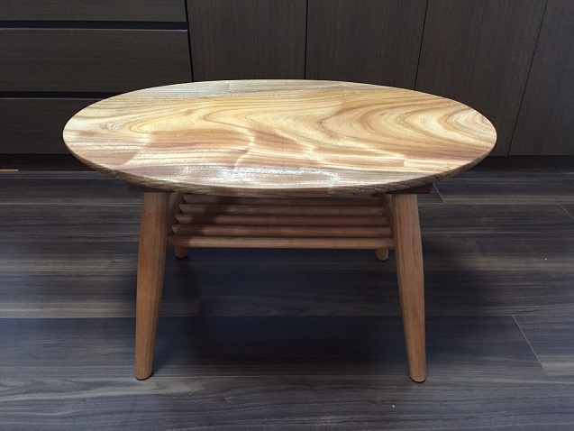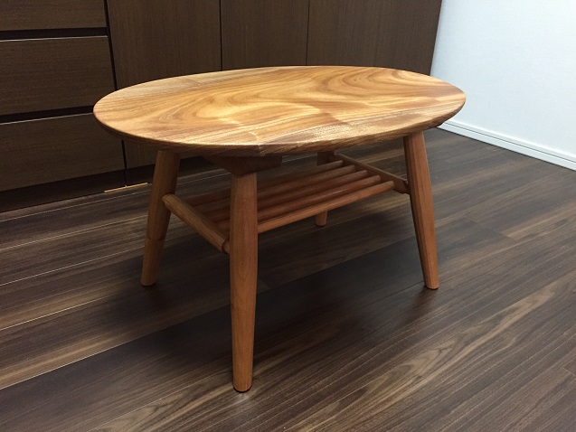 天板一枚板の欅の木目を活かしつつ、洋室に映えることを意識してデザインしました。移動性を考慮して薄めの天板(軽量化)にしていますが、天板側面を板厚が意識しにくい形状にしています。
