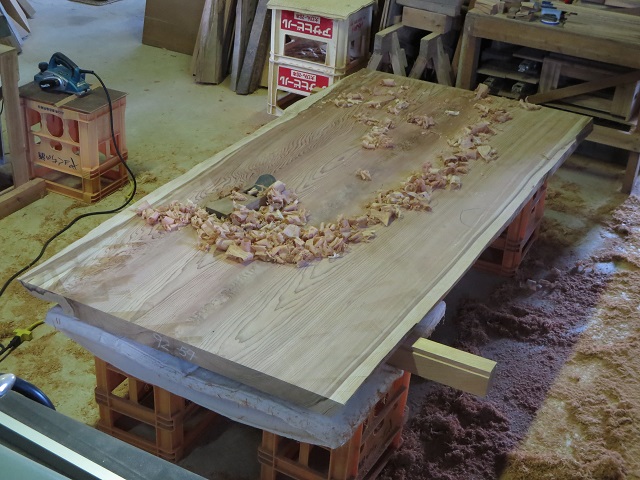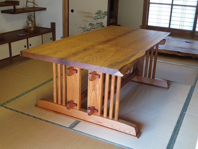 - 屋久杉一枚板を天板とした組立式テーブル。天板は土台に置いているだけで、土台は楔を取り外すことで分解することができます。天板はほぼ同様な筍杢が平行に並んでいるめずらしい(普通はあり得ない)一枚板。恐らく2本の木による連理木(合体木)と思われますが、個人的にここまできれいな連理木(合体木)の一枚板は初めてみました。接合部の木目はすごく複雑に絡み合っています。組立式テーブル01と同じお客様で土台は併用となります。
